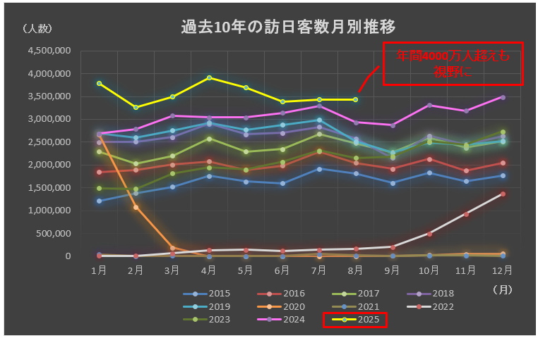 直近の2025年(令和7年)8月の訪⽇客数(推計値)は3,428,000人、前年同月⽐では16.9%増。継続的な訪⽇旅⾏の人気に加え、前月に引き続き東アジアや欧米豪・中東を中心に多くの市場で、子供たちの School Holidays学期間の長期休暇)に合わせた訪⽇需要の高まりがみられた。これらにより、東アジアでは中国、台湾、東南アジアではインドネシア、ベトナム、欧米豪では米国、ドイツを中心に訪⽇外客数が増加したことが押し上げ要因となった。