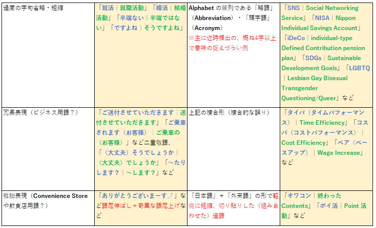 大東亜戦争(対米戦争)後、特に昭和後期~平成期において「言葉の乱れ」が問われて久しく、令和の現在に至っては惨憺たる状況といえる。個別に具体例を挙げるにも、余りにも多様で数も夥しい(おびただしい)ため、本稿では敢えて割愛したい。大まかに類型化すれば以下となろう。ただし所謂「若者言葉」は、他の世代では使用されず使用サイクルも短いため網羅していない。