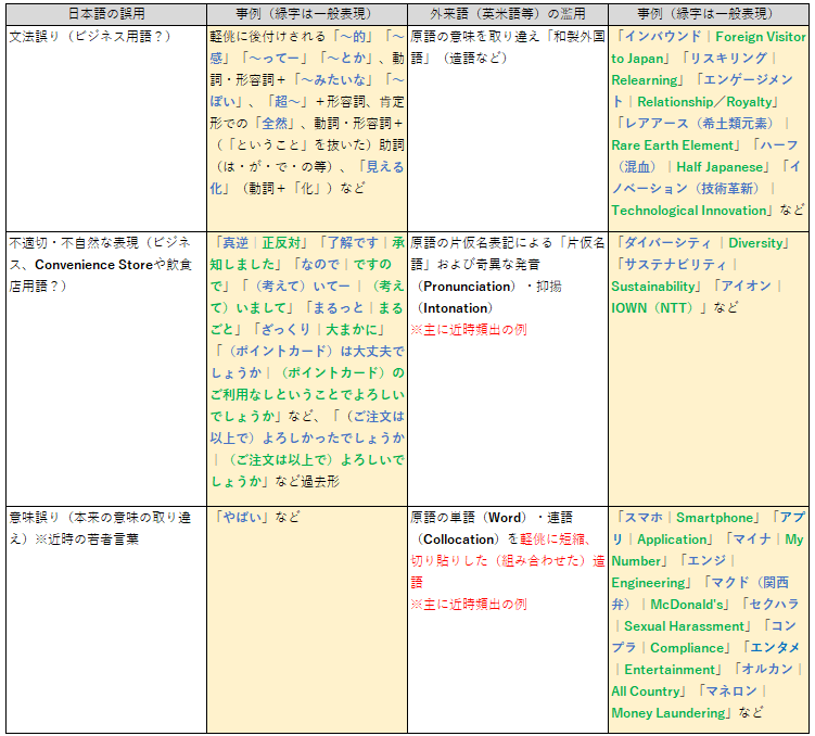 時代を経るごとに状況は深刻化・全世代化し、一定の節目で国家(文部科学省)としての指針策定や是正が図られる必要性を感じる。筆者が「聴覚」に及ぼす強い違和感・嫌悪感の対象として、この「言葉の乱れ」すなわち「日本語の誤用(Misuse)」「外来語の濫用(Abuse)」という社会事象を捉える中、ここでは特に「外来語の濫用」の問題について順序立てて論考する。