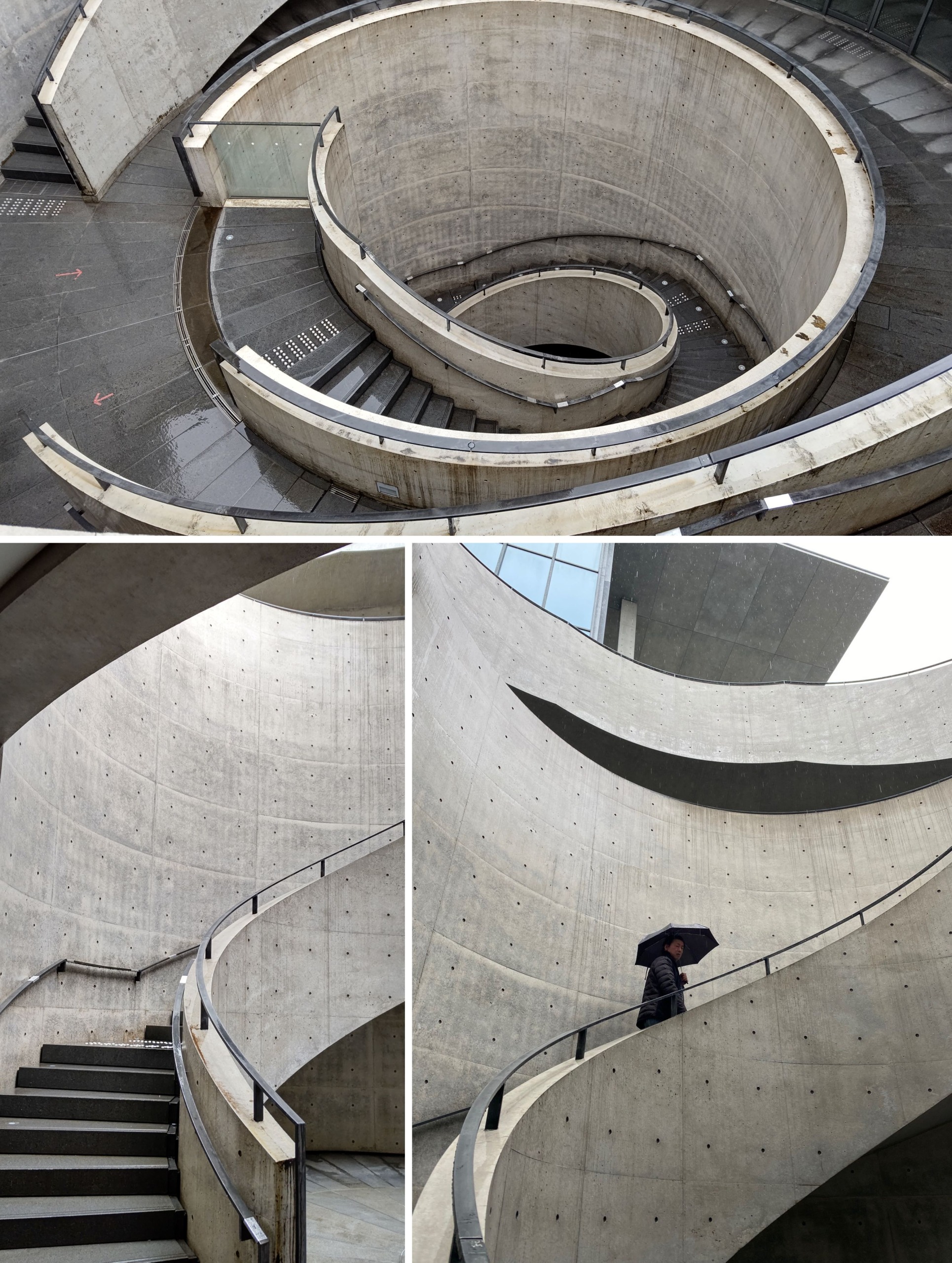 ⇧「兵庫県立美術館」コンクリート打ちっ放しが特徴的な円形テラスの螺旋階段と筆者