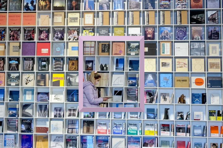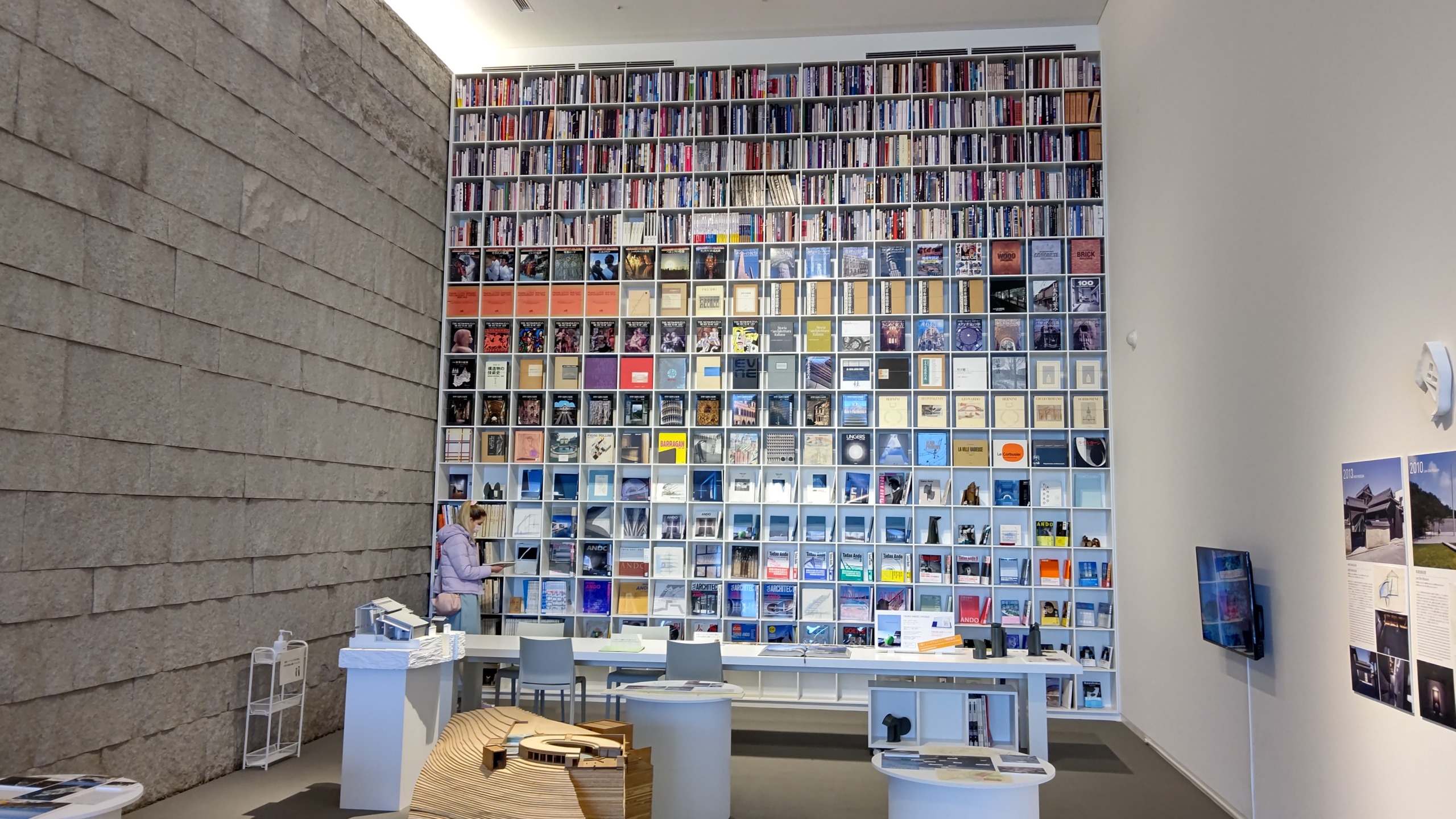 ⇧兵庫県神戸市中央区「兵庫県立美術館」(建築家・安藤忠雄氏設計による「建築の著作物」)第2展示棟の「Ando Gallery」、壁一面に収納された建築関連書籍と Wolf(当社海外渉外顧問)