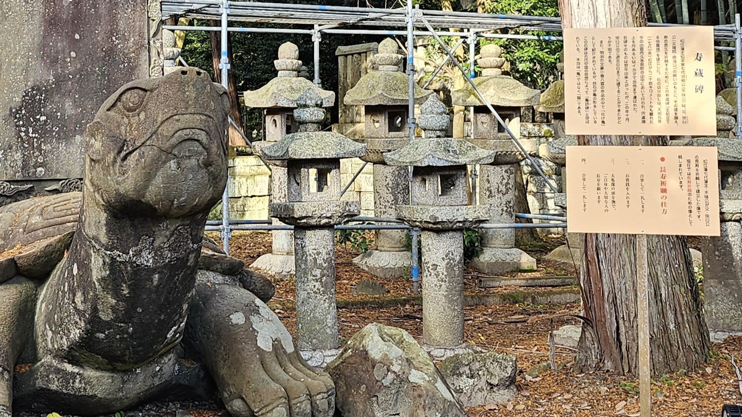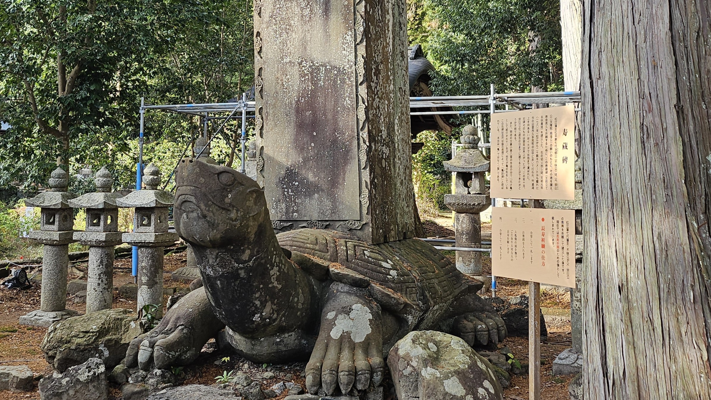 ⇧境内に残る寿蔵碑を背負う「大亀像」は長寿祈願の象徴、また大亀像は夜な夜な動き出して人々に災いをもたらす恐ろしい存在であったが、亀自らが大きな石碑を背負い二度と動けぬ様自らを封じたとの伝承(小泉八雲『知られざる日本の面影』に登場する「化け亀」より)