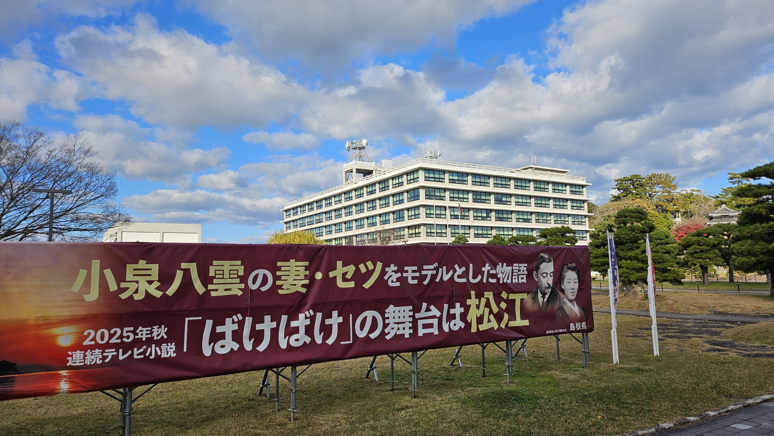 2025年(令和7年)後期放送で現在好評を博している NHK 連続テレビ小説『ばけばけ』。このドラマの主人公(男女)のモデルは、明治期松江の作家・小泉八雲(こいずみやくも|Lafcadio Hearn)(※1)とその妻・セツ。筆者はこれに通じるものもあり、還暦を目前にして漸く(ようやく)ながら、「特急やくも」に揺られて外祖母の先祖の地である出雲国・島根県松江市を訪ねた。