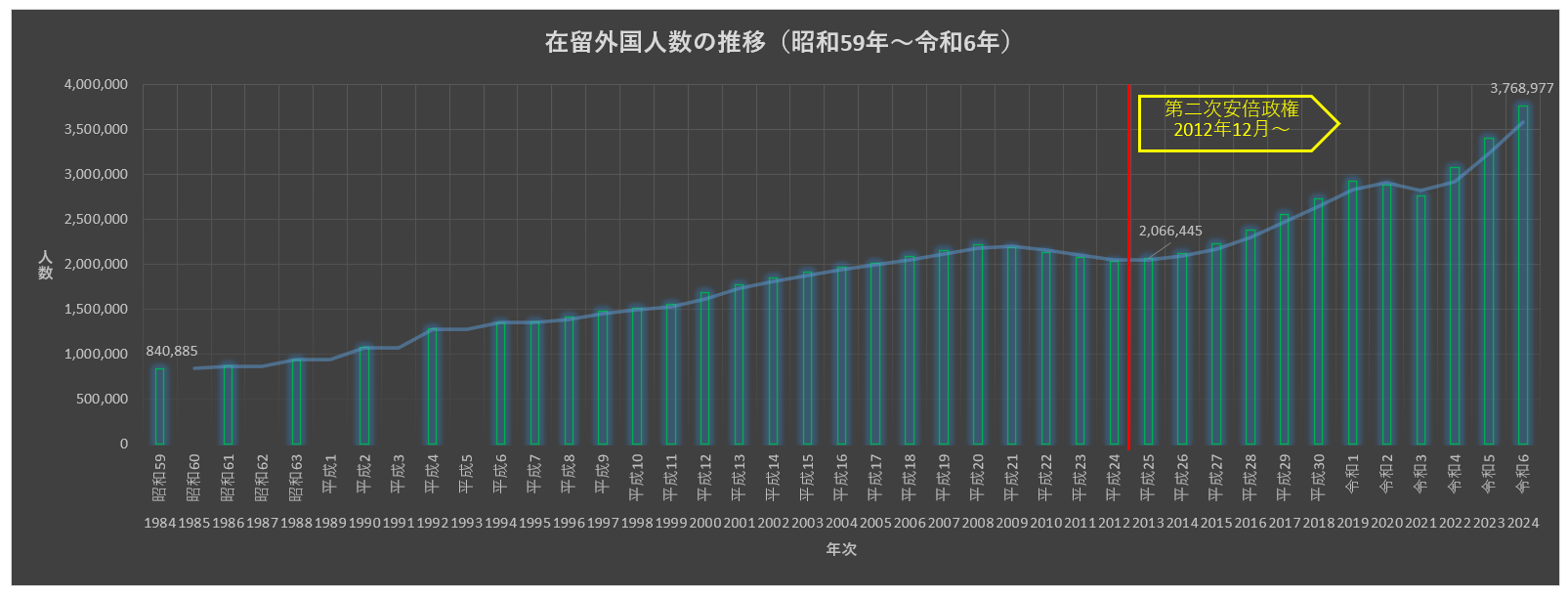 以下の在留外国人数推移および国籍別構成比グラフは、「法務省」(出入国在留管理庁)  【在留外国人統計(旧登録外国人統計)統計表】 | 出入国在留管理庁 令和6年末現在における在留外国人数について | 出入国在留管理庁 を基に筆者作成。在留外国人数は2012年(平成24年)12月からの第二次安倍政権以降、新型コロナウイルス禍での一時減少を挟むものの急増傾向にある。