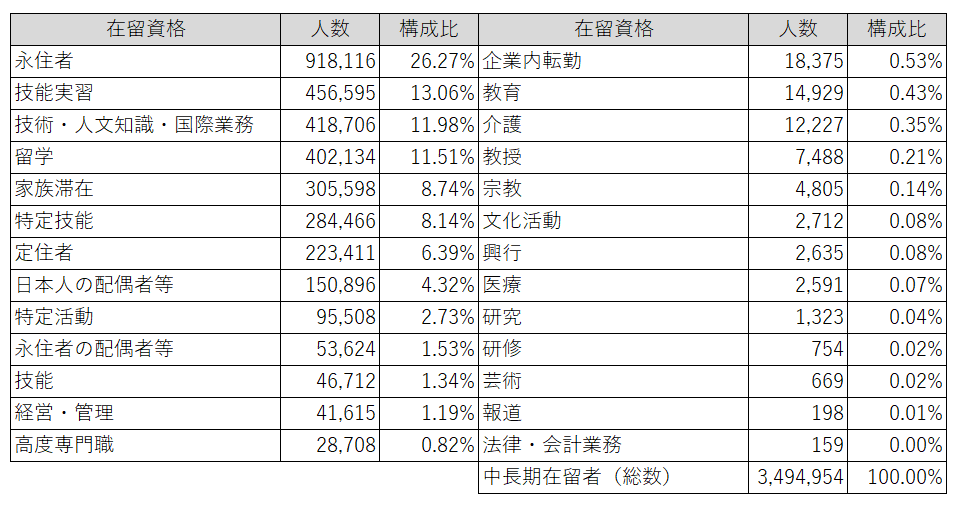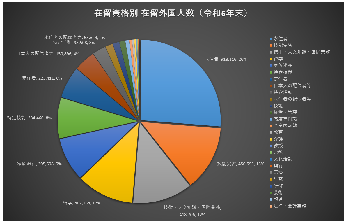 以下は、2024年(令和6年)末の在留資格(Status of Residence)別 在留外国人数と構成比を示す。数字は総数から「特別永住者」(※1)を除いた「中長期在留者」。