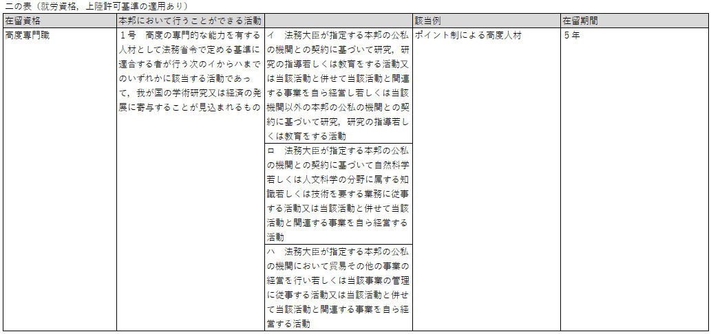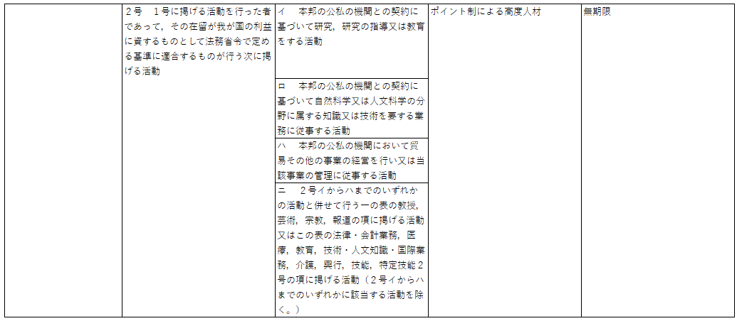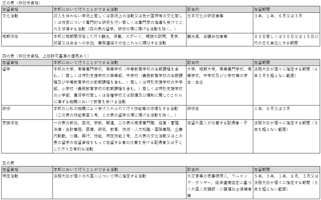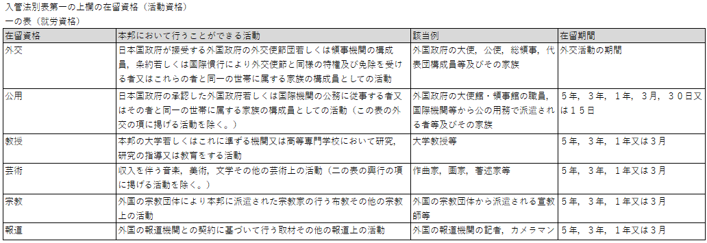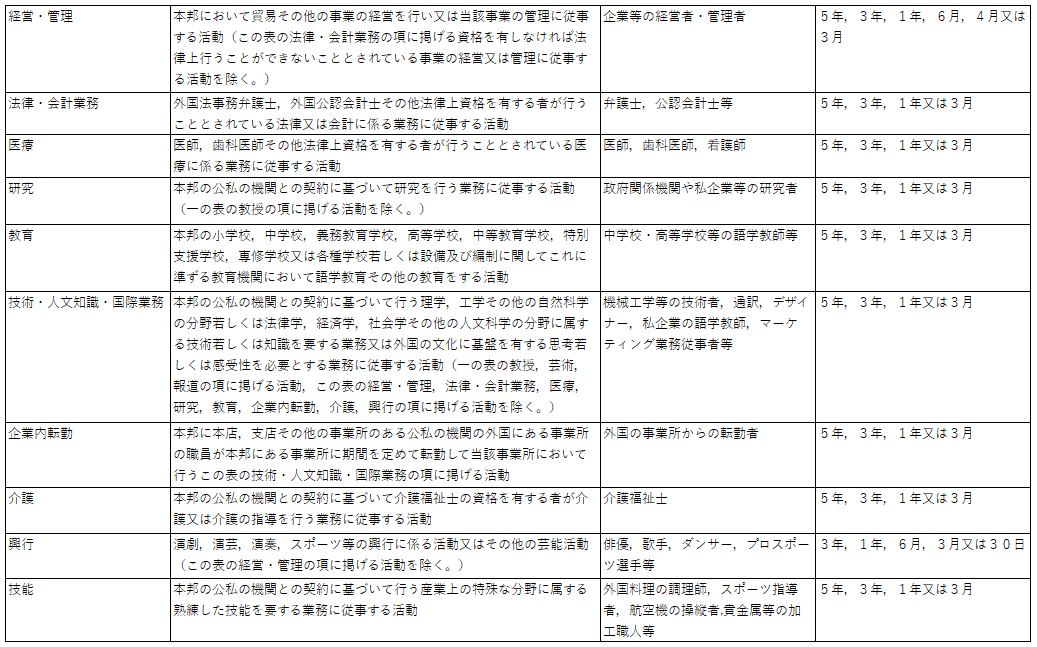 以下の在留資格一覧は、「法務省」(出入国在留管理庁在留資格一覧表 | 出入国在留管理庁 を基に筆者作成。