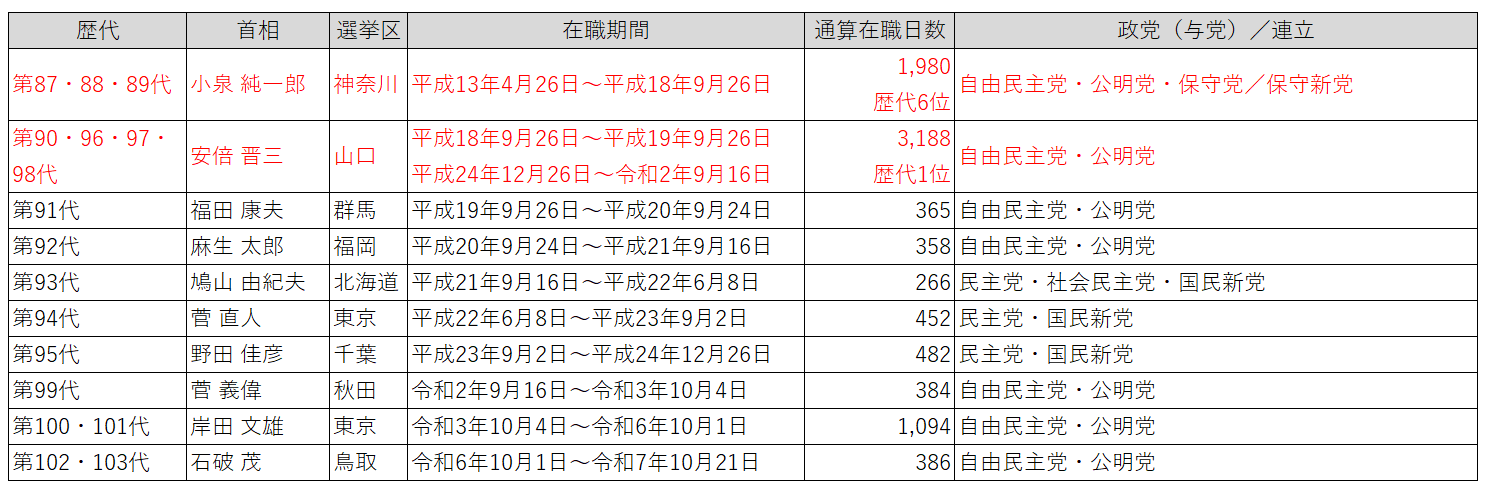【後日追記】首相指名選挙を経て10月22日に鳴り物入りで発足した自民・維新連立内閣。発足直後に迎えた日米首脳会談で「Trump 氏の盟友・安倍元首相の継承者」とメディアが過熱気味に報道し、その一点をもって米国指導者「個人」に殊更不自然に阿る(おもねる)姿に、日本人の一人として筆者は不愉快さを禁じ得ない。その後も期待先行による全面的な肯定評価の論調に対して違和感が残る。しかし同内閣が、政権基盤の脆弱さからまたもや短命で潰える虞は十分にある。その後を睨んで筆者は、前述の熟練した政権運営手腕の期待できる林芳正氏の登板以外に、現在日本が向き合う難局を乗り切る術はない様に考える。以下は、21世紀(2001年~)以降の25年間に在職した首相と在職日数、政権与党の一覧である(首相官邸ウェブサイトを基に筆者作成)。 歴代内閣 | 首相官邸ホームページ 内閣制度と歴代内閣