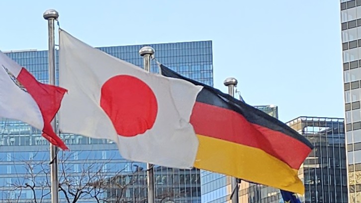 ⇧ドイツ連邦共和国総領事館が所在する、大阪市北区の梅田スカイビル・タワーイースト前に掲揚の日独国旗