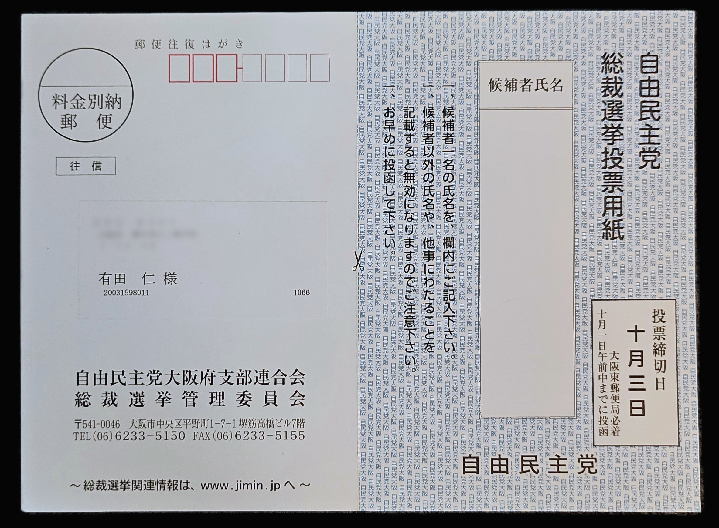 ⇧有権者(党員・党友等)による投票用紙、得票は国会議員票に加味され2025年(令和7年)10月4日投開票