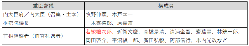なお「重臣會議」は昭和前期に存在した、天皇に対する後継首相の「奏薦」や国家の最重要事項に関する意見具申のための機関。天皇の諮問に応じて「内大臣」(ないだいじん)(※7)により主宰され、首相経験者のうち「前官礼遇者」(功労顕著により、退官後も在官中の待遇を与えられた者)と「枢密院」(すうみついん)(※8)議長および主宰者である「内大臣」により構成された。「重臣會議」は最後の「元老」である西園寺公自身が最晩年に構想し設置を勧告したものであり、「重臣」を構成する首相経験者の召集も公自身により行われている。これは憲法・法律上の規定によらない非公式な機関であり、大東亜戦争(対米戦争)後に「内大臣」および「枢密院」が廃止されるまで開催された。