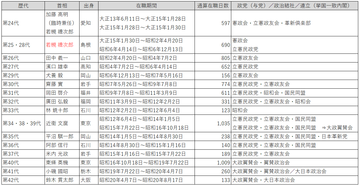 以下は戦前昭和混乱期に在職した首相の一覧である(首相官邸ウェブサイトを基に筆者作成)。 歴代内閣 | 首相官邸ホームページ 内閣制度と歴代内閣 当該20年間に目まぐるしく首相が交代した様は、安倍晋三・長期安定政権以降、与党(自民党)の派閥が消滅(表面上の弱体化)する一方(野党の)多党化が進み、混迷と不安定さを増す令和の連立政権の状況と重なる。戦前昭和期には、明治・大正期に中央政界に重きを成した藩閥出身指導者や元老の存在がほぼ失われた。最後の元老であった西園寺公望公が1940年(昭和15年)に他界の後は、昭和天皇や「重臣」の努力をもっても、軍部(陸軍)の台頭を抑え込み秩序を維持することが困難となっていった。