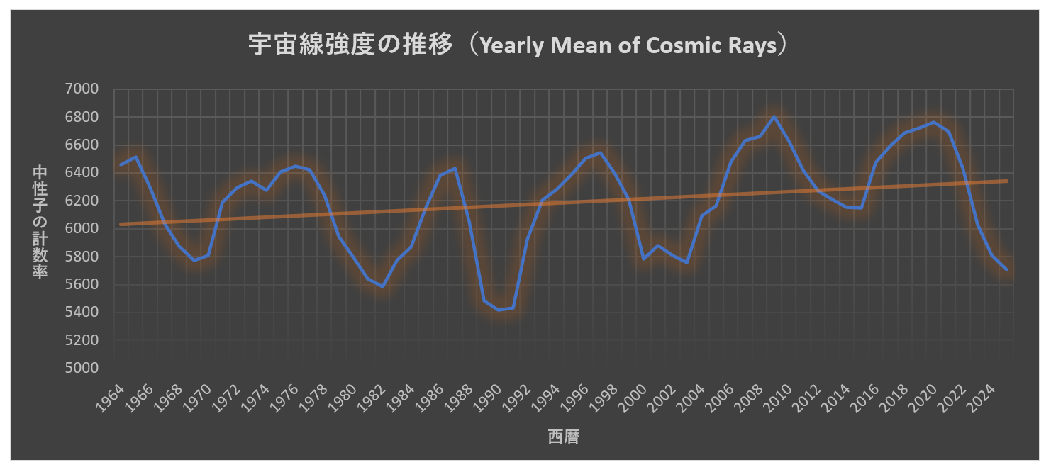 以下グラフは1964年以降の宇宙線強度(補正後の中性子計数率)の推移を示している。フィンランドの Oulu 大学「中性子モニターステーション」(Oulu Cosmic Ray Station)観測データ Oulu Cosmic Ray Station を基に筆者作成。(未完成・精査中)